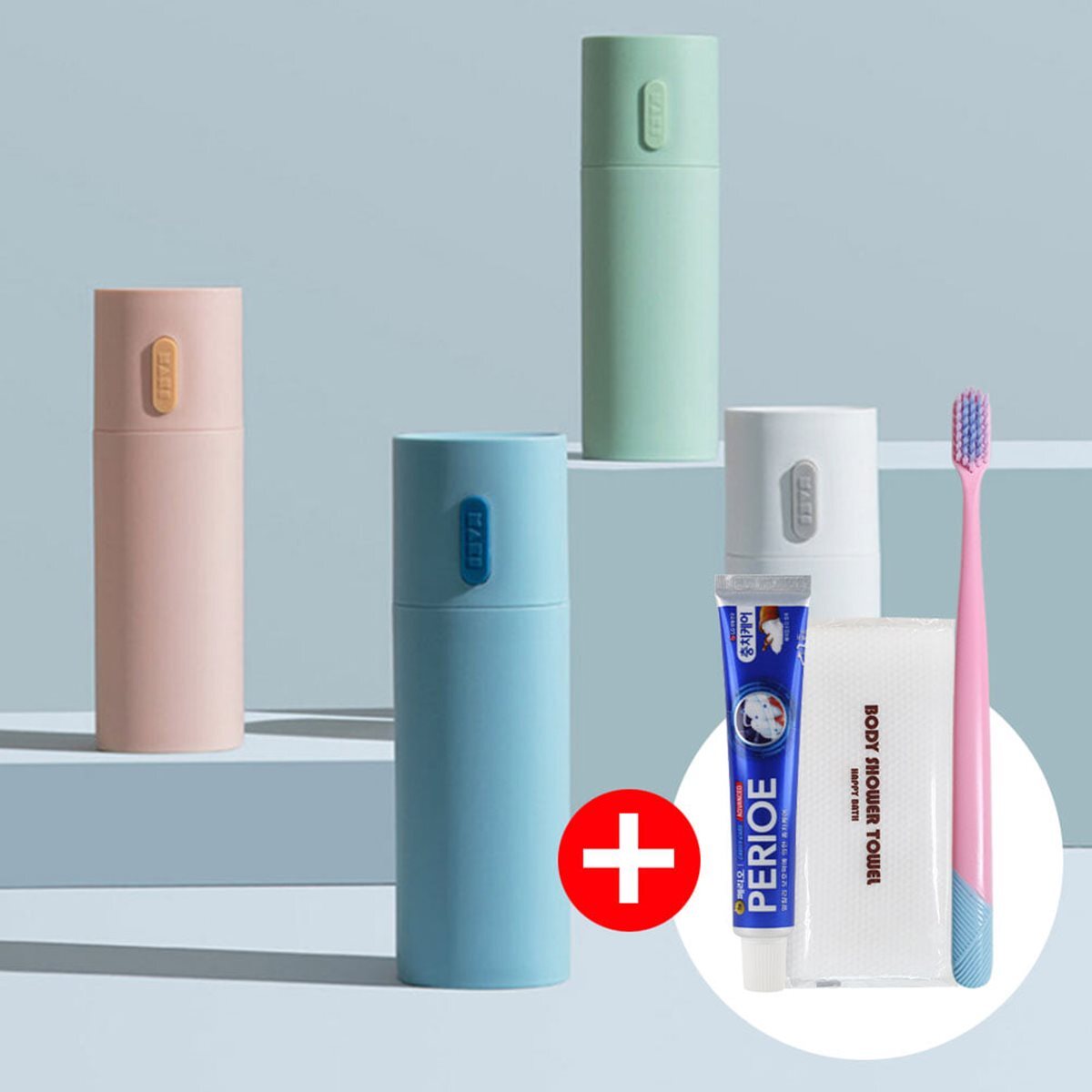 [문구/GIFT] 파스텔 휴대용 치약칫솔세트 샤워타올 포함 여행용 외출용 사무실용 보관함